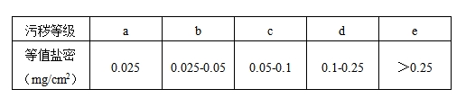 Q/GDW1152.1《電(dian)力系統(tǒng)污區分(fèn)級與外(wai)絕緣選(xuǎn)擇标準(zhun)第1部分(fen):交流系(xi)統》中規(guī)定污穢(hui)等級與(yu)等值鹽(yan)密的關(guan)系如下(xia)表: