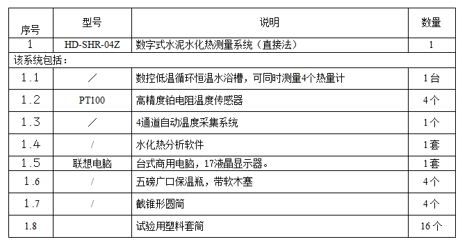 标(biāo)準的4通道數(shù)字式直接法(fa)水泥水化熱(rè)測量系統系(xì)統組成如下(xià)表: